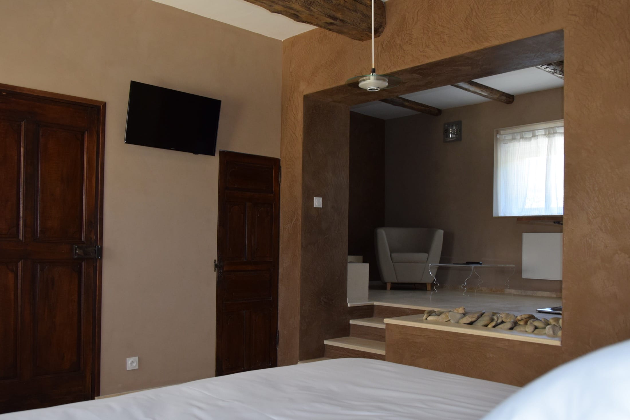 Votre chambre est composée d’un salon, d’un lit confortable King Size et d’une salle d’eau avec douche, toilettes, sèche-cheveux, échantillons de bienvenue, peignoirs et serviettes.