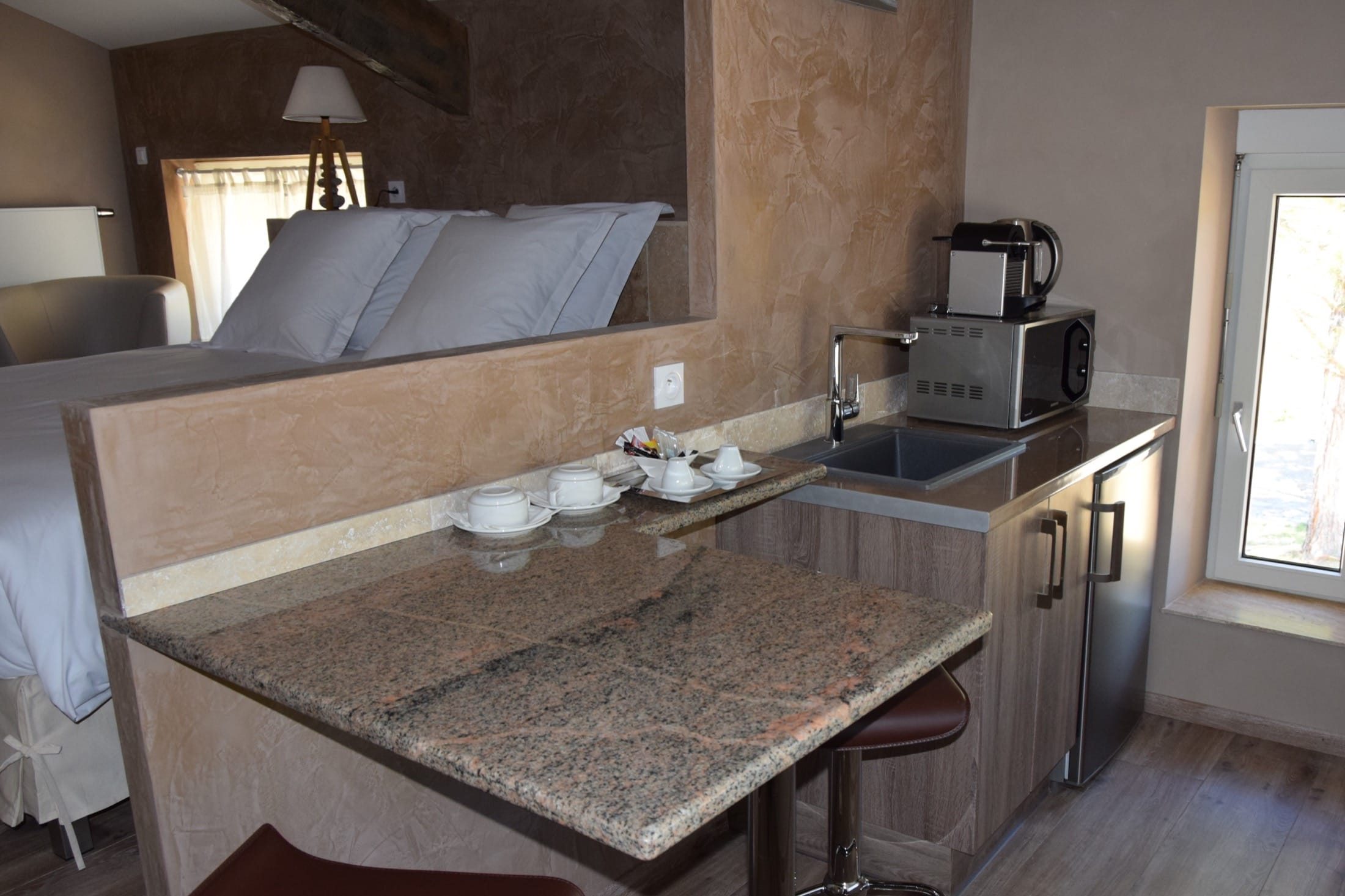 - Équipements : Cafetière Nespresso et bouilloire, Climatisation, Coffre-fort, Peignoirs et serviettes, Réfrigérateur et micro-ondes, Salle de bain privée, Télévision écran plat, WiFi